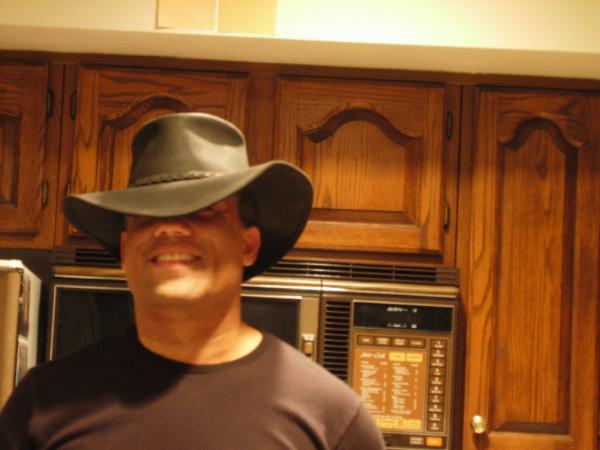 | I'm getting ready to go into the studio soon to start recording a new album, "Across the Open Sky"... I'm really excited about this new collection of songs, which are kind of like an amazing blend of acoustic rock, country and emo... So, I thought maybe I'd get me a cowboy hat for this one (lol)... I took this shot myself, using the timer on the Nikon... (Jan. 24, 2007, goofing around in the kitchen at 7 SunnyB.) |