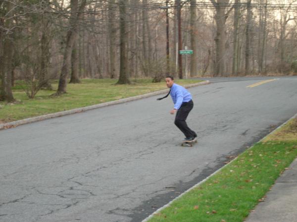 | Of course, most of the time I'm on dry land, and I was blessed recently to get this new skateboard that helps me keep my stoke going on days when asphalt is the best available option... Here I am street surfing by my Mom's house in New Jersey (Nov. 25, 2006)... Yeah, I know you're probably wondering why I'm all dressed up... well, we had just come back from a funeral and we all needed some cheering up... so I entertained my sister's kids while her husband Walker took this great photo... the kids kept shouting out to me, "Do some tricks! Do some tricks!" I'm thinking... "Where's Tony Hawk when you need him?" |